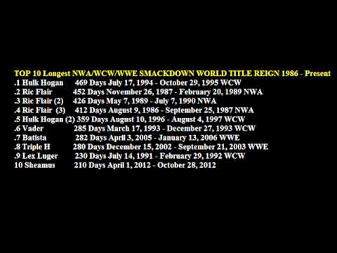 TOP 10 Longest NWA WCW WWE SMACKDOWN WORLD TITLE Big Gold Belt REIGNS 1986 - Present - 469 Wrestling Themes WWF WW TNA WCW - http://www.youtube.com/user/frankiemcadams .1 Hulk Hogan 469 Days July 17, 1994 - October 29, 1995 WCW .2 Ric Flair 452 Days November 26, 1987 ...